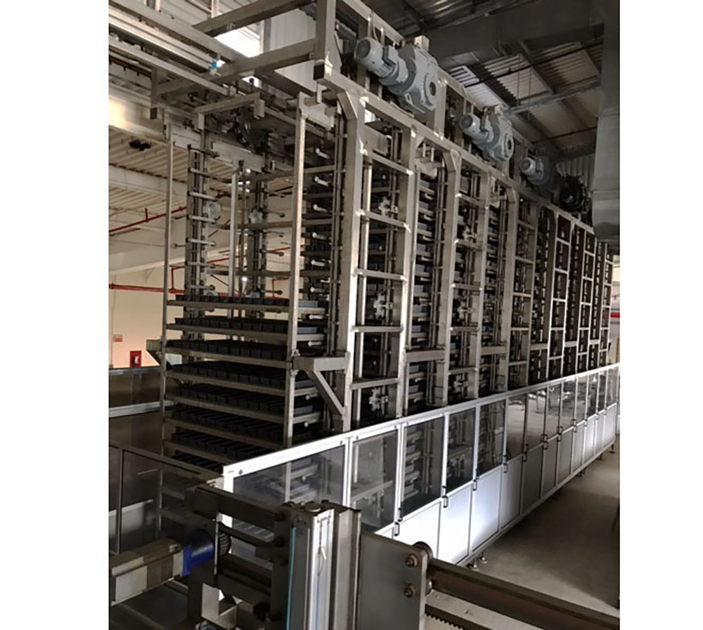 - Continuous conveyor system for the baking pans including storage, stoppers, curves etc.