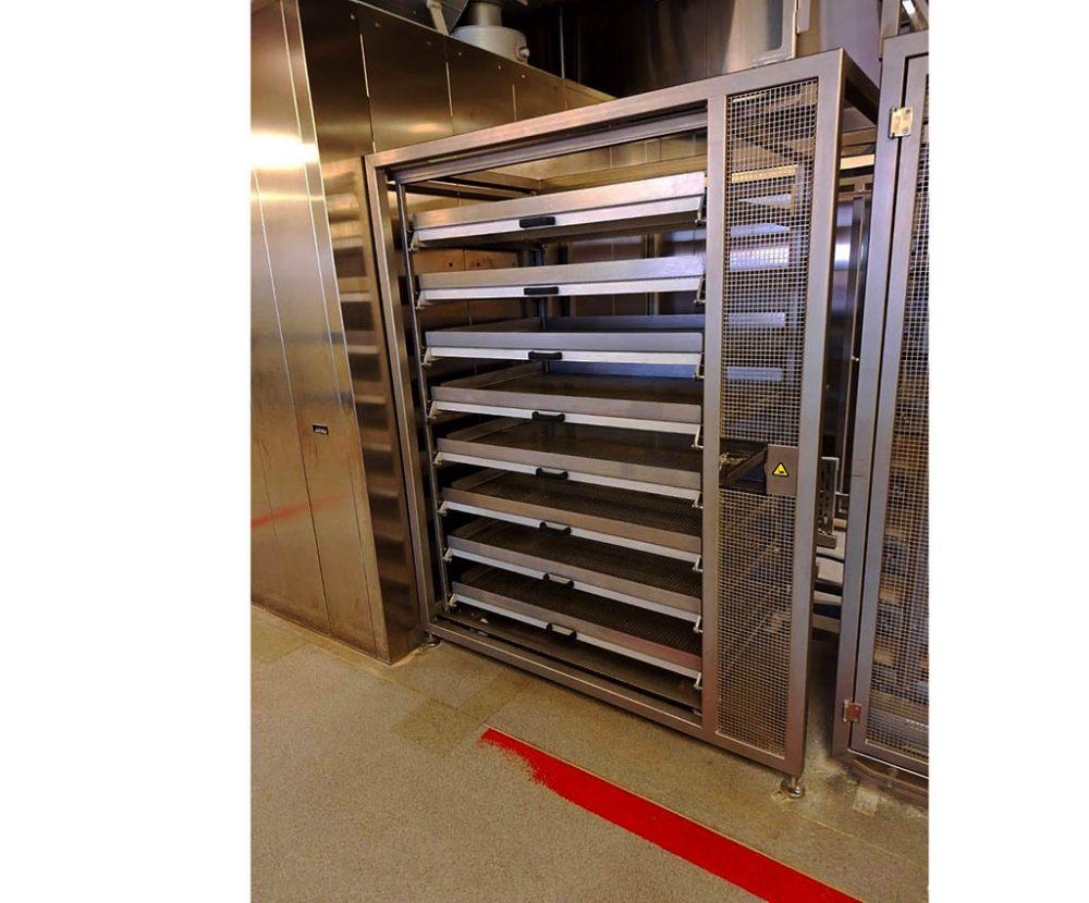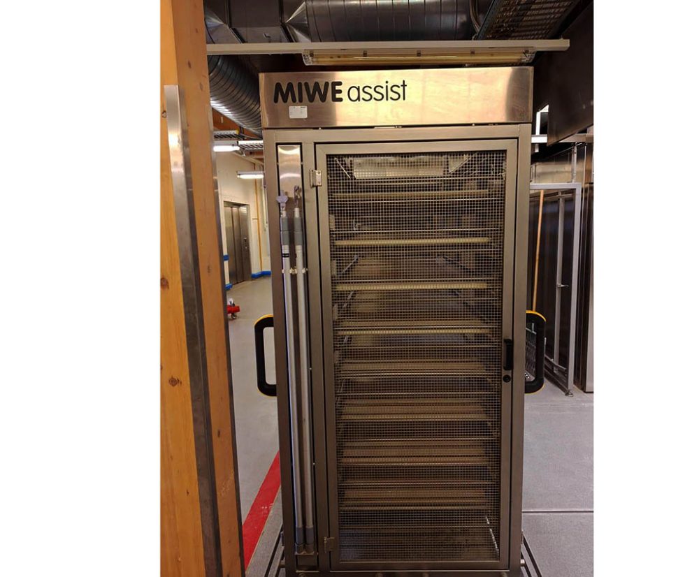 Unloading position for the MIWE Assist. The MIWE Assist places the baked breads in a special trolley were the breads need to be taken of manually.